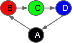 Here is an example Markov Chain representing a cycle of 4 states (A,B,C,D). Each state has a colour. The colour of the current state is observable. This graph shows that Red comes after Black. Green comes after Red. Blue follows Green, and Black follows Blue:Markov chains are normally drawn as graphs, with states being represented as vertices (aka nodes, typically presented as circles or ellipses). Changes in system state are represented by transitions between vertices in the graph. Edges in the graph represent potential changes, usually annotated with transition probabilities; there may be more than one possible future state from the current state. When represented as a Markov chain, the history of a system is always a sequence of visited states without forks or joins.